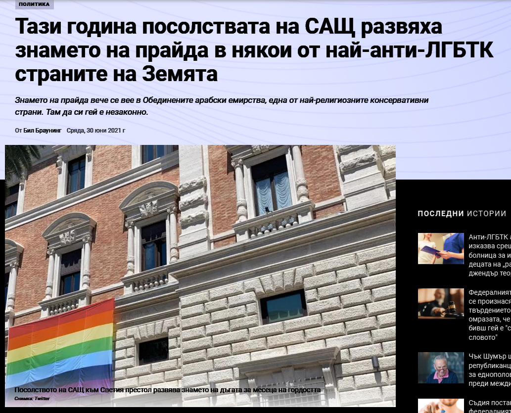 Т.е. само за десет години, мнение, споделяно от водачите на либерстката американска Демократична партия, се превръща в абсолютно табу. Нещо повече - през лятото на 2021 г., броени седмици, преди героичните Талибани да освободят страната си от бруталната и нечувано жестока Натовска окупация, американските посолства в мюсюлманските държави развяха така нареченото гейско знаме (с цветовете на дъгата).