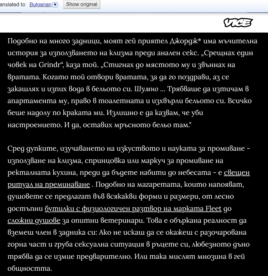 Да обаче забранената любов е забранена, защото не е любов и е доста противна. Лезбийките стимулират клитора с всичко под ръка. Браво на тях. Но педерасите са изправени пред сериозен проблем. В задника има лайна. И ако нещо отвори задника, сещате се какво може да стане. Затова педерасите си правят клизми. Не винаги им се получава добре и понякога се изтърват върху килима.