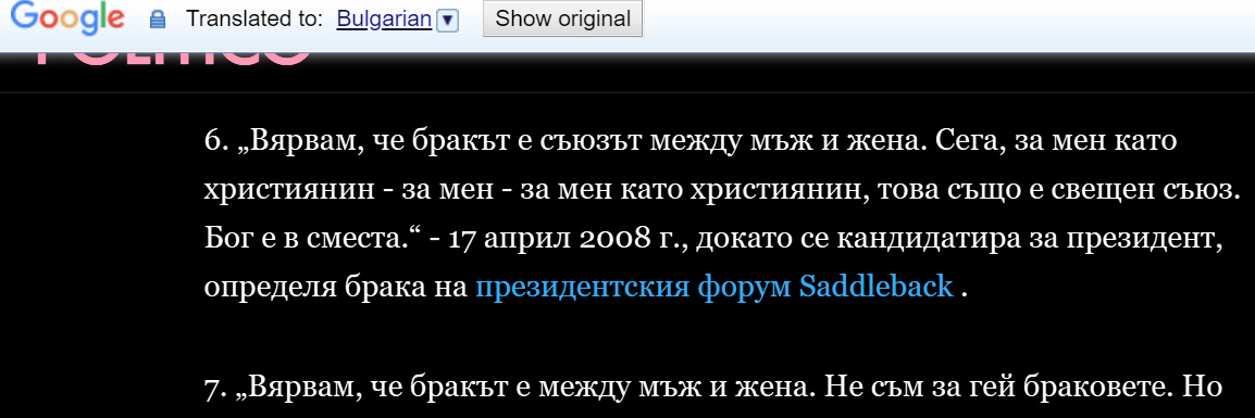 Общественото мнение се оказва голям проблем и за Хилъри Клинтън и Барак Обама, които се борят за президентската позиция и много зависят от гласовете на черните. Така че и Хилъри и Обама се изказват против гейския "брак" почти до 2015 г., когато Върховният съд открива над 200 години след написването й, че американската конституция одобрява брака между двама мъже. Например на 2-ри ноември 2008 г., Обама казва "Вярвам, че бракът е между мъж и жена. Не съм за гей браковете." Списание Атлантик пък ни казва, че "до 2013 г. [Хилъри] заемаше позиция, която много гласоподаватели на демократите сега смятат за дълбоко погрешна."