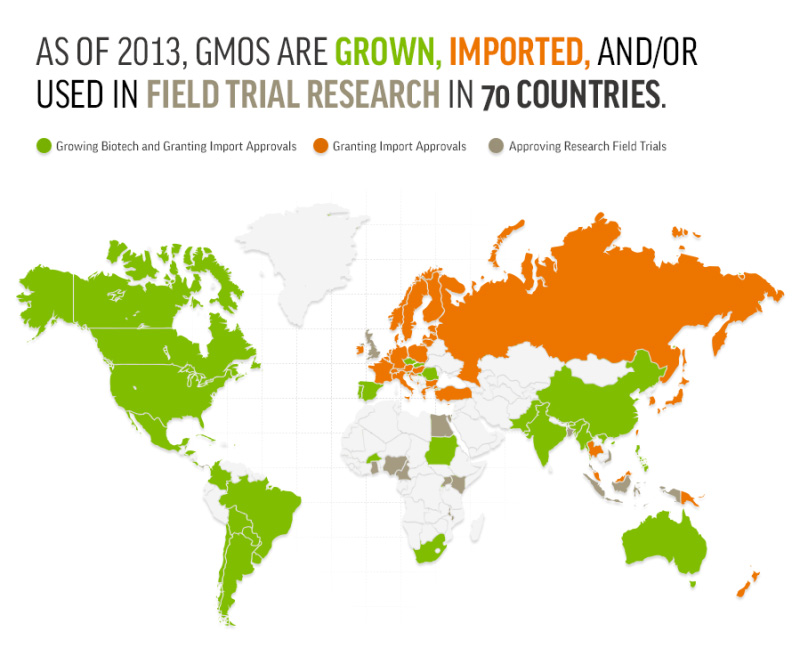 ГМО по света през 2013 г. Зелено = разрешено производство. Оранжево = разрешен внос. Сиво = разрешени изследвания. Източник: geneticliteracyproject.org.