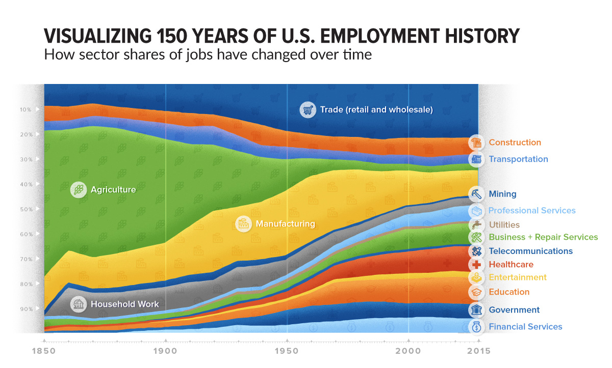 Заетост по сектор в САЩ. Източник visualcapitalist.com.